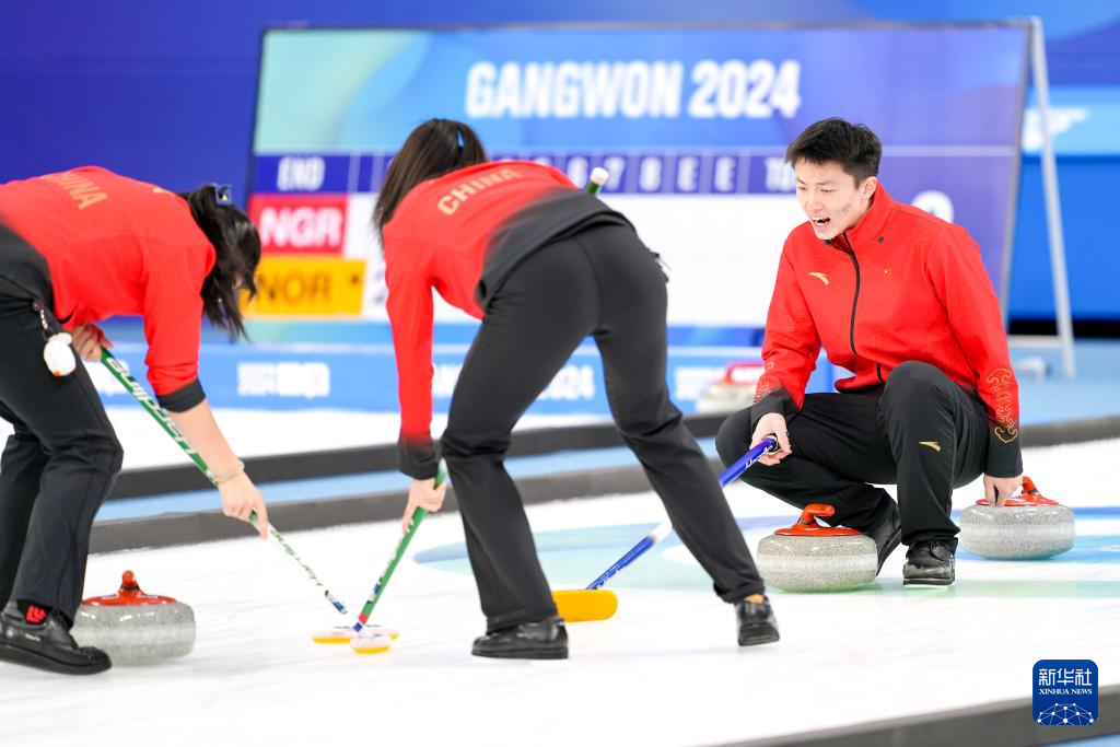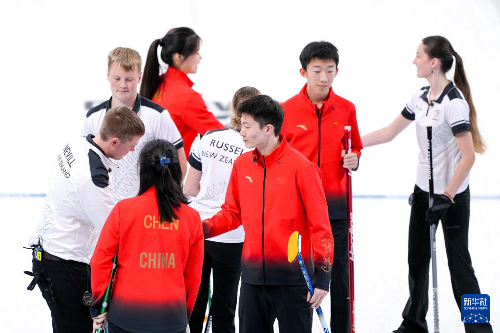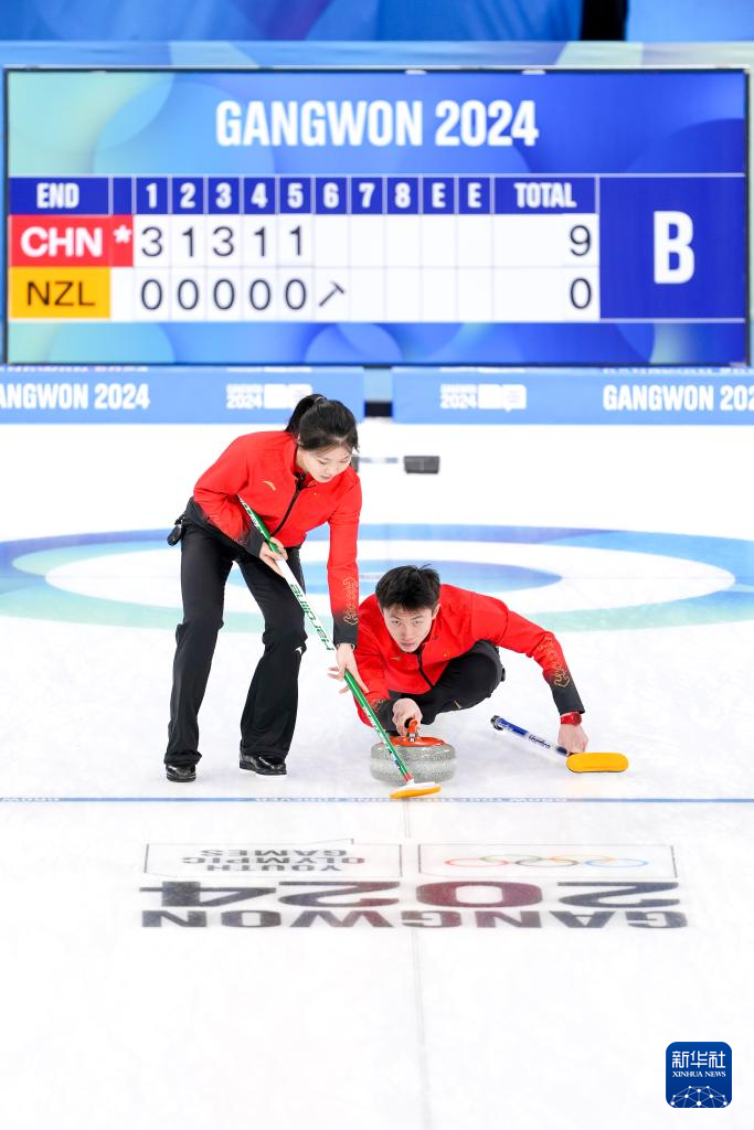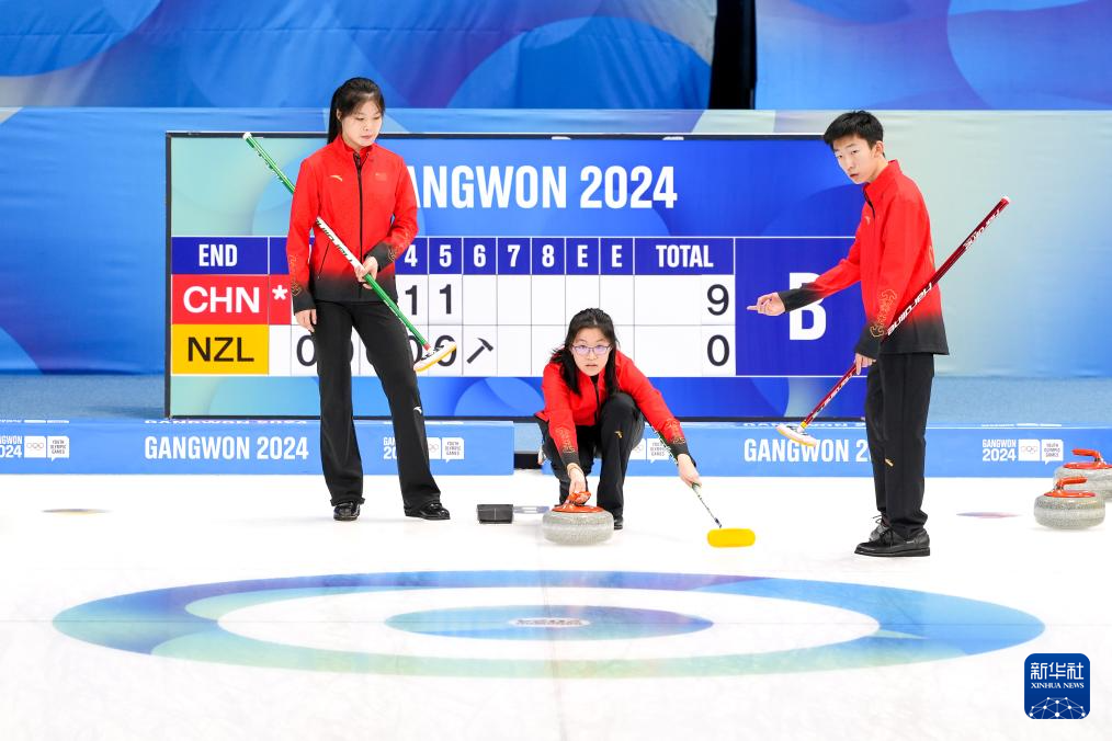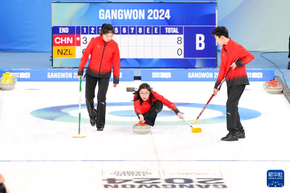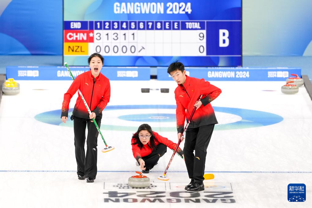 当日,在韩国江陵举行的2024年江原道冬青奥会冰壶混合团体循环赛中,中国队以9比1战胜新西兰队。