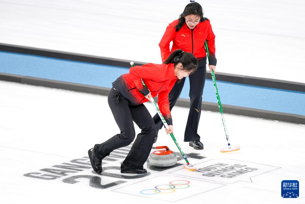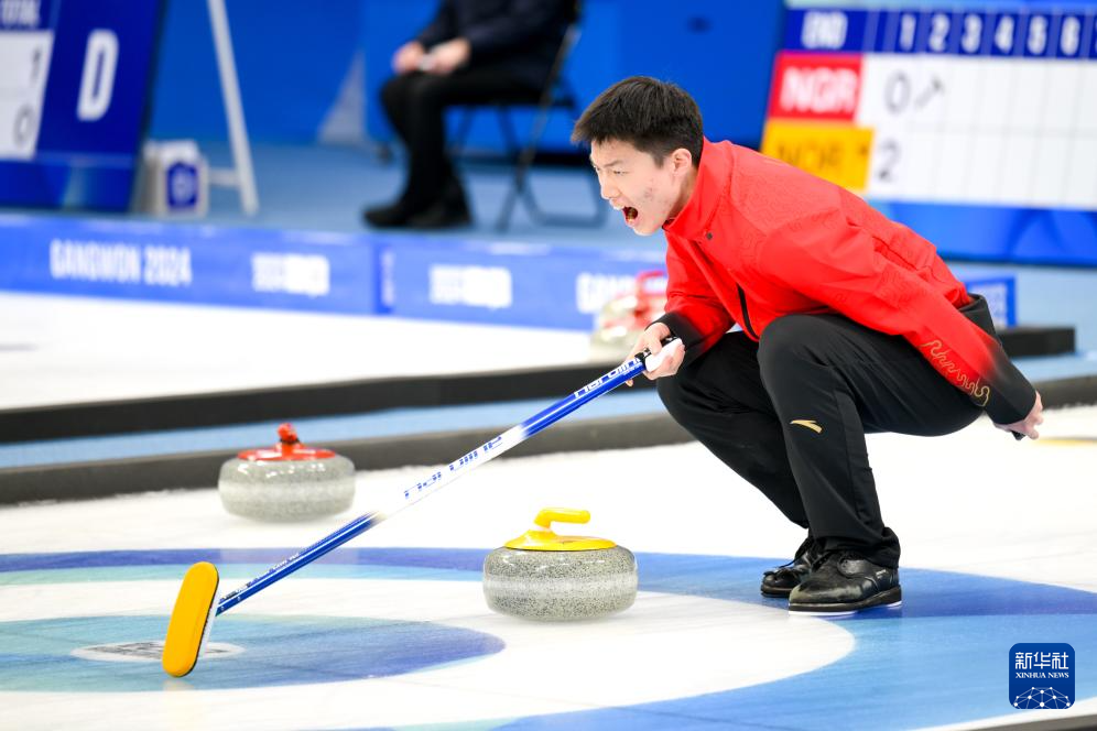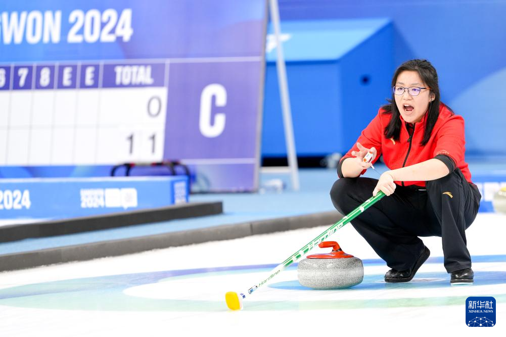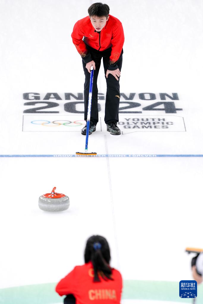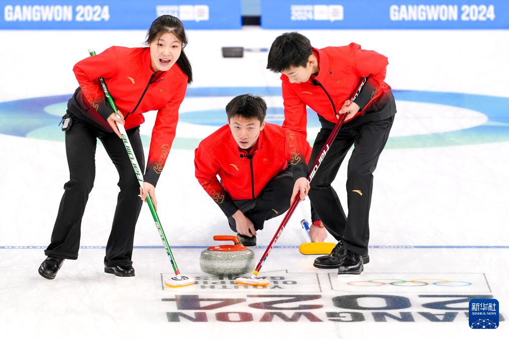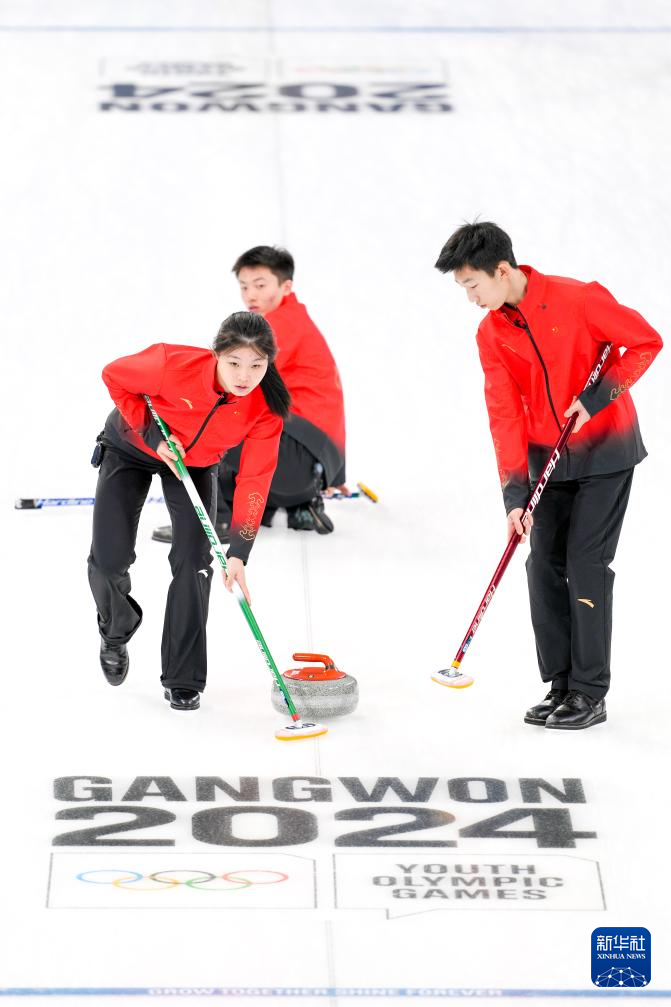 当日,在韩国江陵举行的2024年江原道冬青奥会冰壶混合团体循环赛中,中国队以9比1战胜新西兰队。