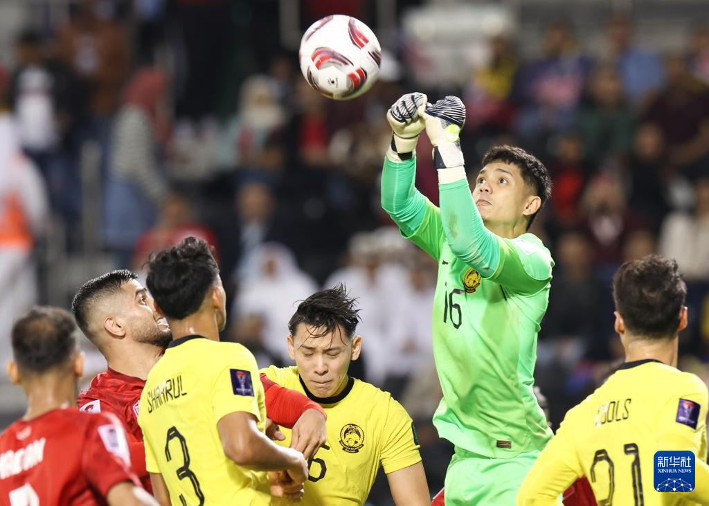 1月20日,马来西亚队门将艾哈迈德·西汉·哈茲米(右二)在比赛中扑救。新华社记者 丁汀 摄