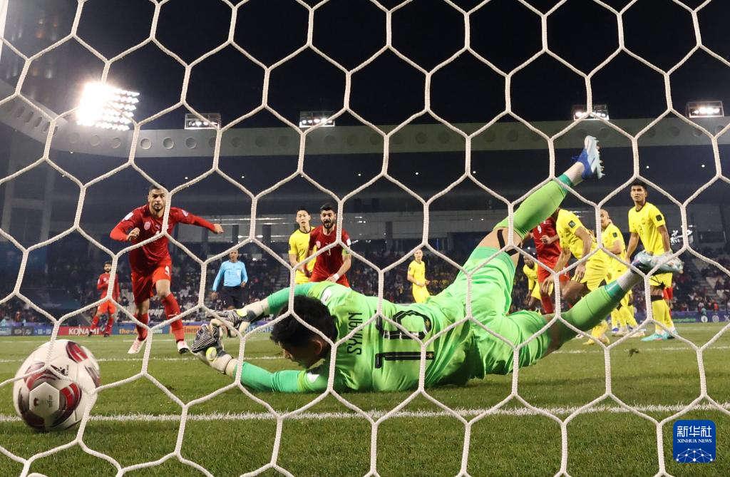 1月20日,马来西亚队守门员艾哈迈德·西汉·哈茲米(前)在比赛中未能扑出巴林队球员阿里·马丹的射门。新华社记者 贾浩成 摄
