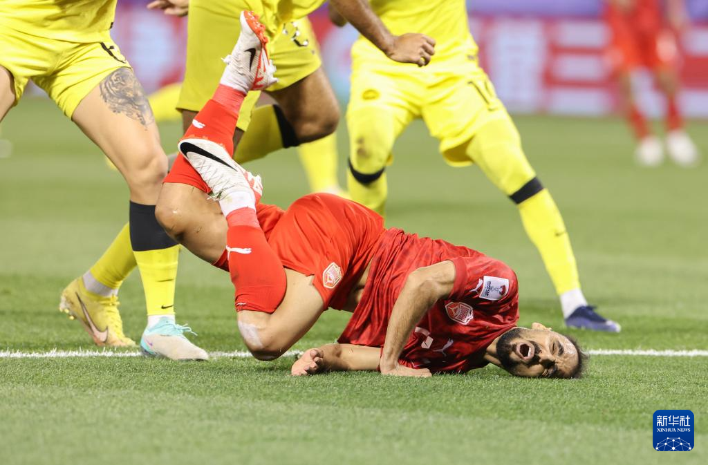1月20日,巴林队球员阿里·马丹在比赛中倒地。新华社记者 丁汀 摄