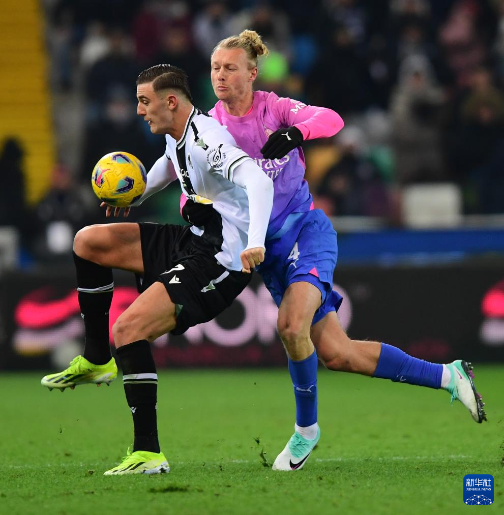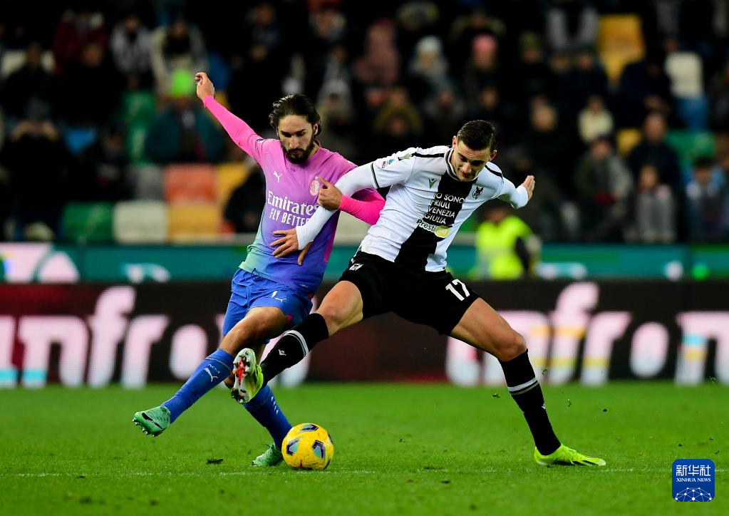 1月20日,AC米兰队球员克亚尔(右)与乌迪内斯队球员卢卡在比赛中拼抢。新华社发(瓦莱里娅·阿比斯摄)