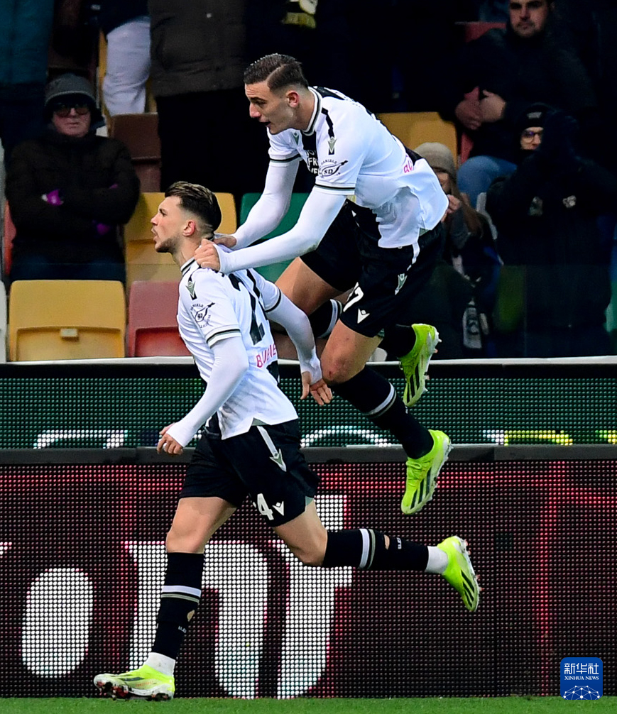 1月20日,乌迪内斯队球员萨马尔季奇(左)与队友卢卡庆祝进球。新华社发(瓦莱里娅·阿比斯摄)