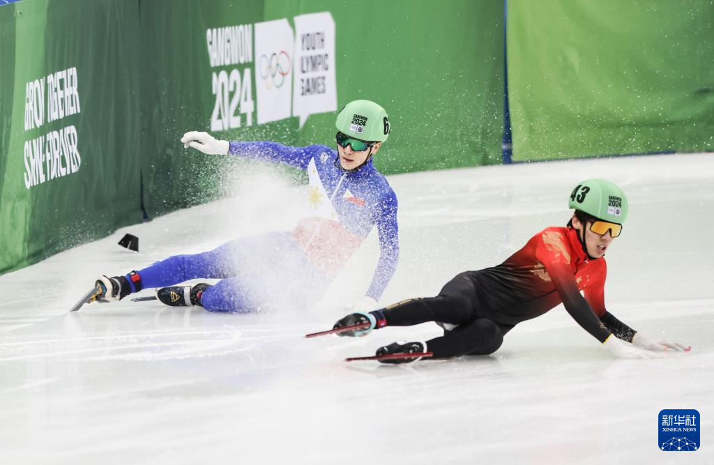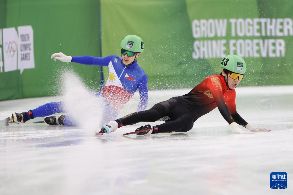 1月22日,中国选手张柏浩(右)在比赛中与菲律宾选手格罗斯克洛斯发生碰撞。最终,张柏浩以45秒685的成绩获得第四名。新华社记者 许雅楠 摄