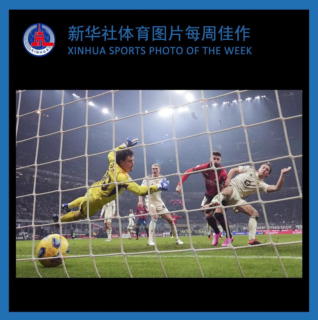 1月14日,AC米兰队球员吉鲁(右二)在比赛中射门得分。当日,在2023-2024赛季意大利足球甲级联赛第20轮比赛中,AC米兰队主场3比1战胜罗马队。