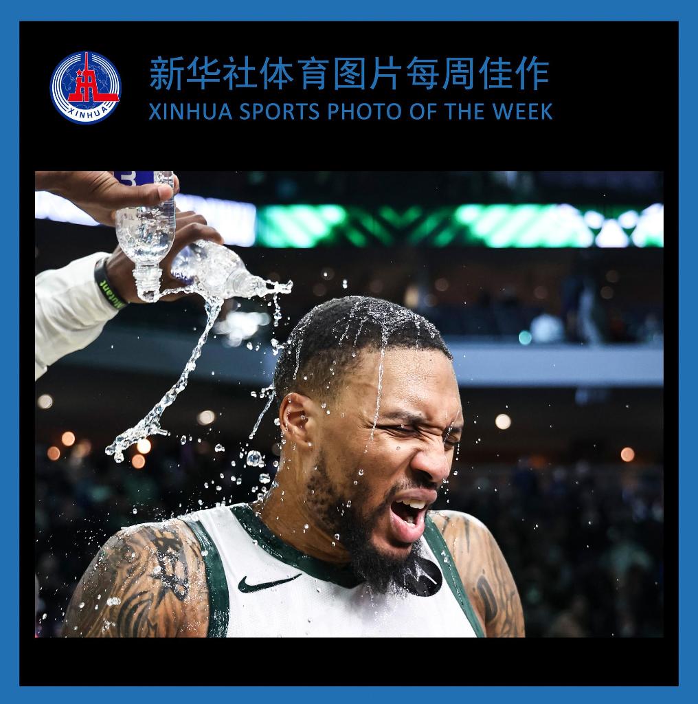 1月14日,雄鹿队球员利拉德在比赛中投中制胜三分球后被队友浇水庆祝。当日,在2023-2024赛季NBA常规赛中,密尔沃基雄鹿队主场143比142战胜萨克拉门托国王队。