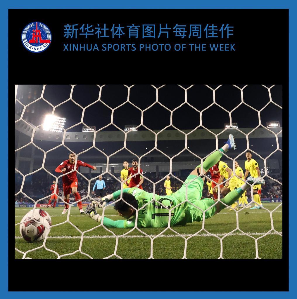 1月20日,马来西亚队守门员艾哈迈德·西汉·哈茲米(前)在比赛中未能扑出巴林队球员阿里·马丹的射门。当日,在卡塔尔多哈贾西姆·本·哈马德球场举行的男足亚洲杯小组赛E组比赛中,巴林队1比0战胜马来西亚队。