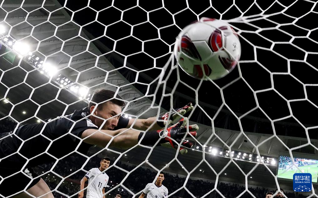 1月21日,吉尔吉斯斯坦队守门员托科塔耶夫(中)在比赛中未能扑出沙特阿拉伯队球员费萨尔·加姆迪(未在画面中)的射门。新华社记者 贾浩成 摄
