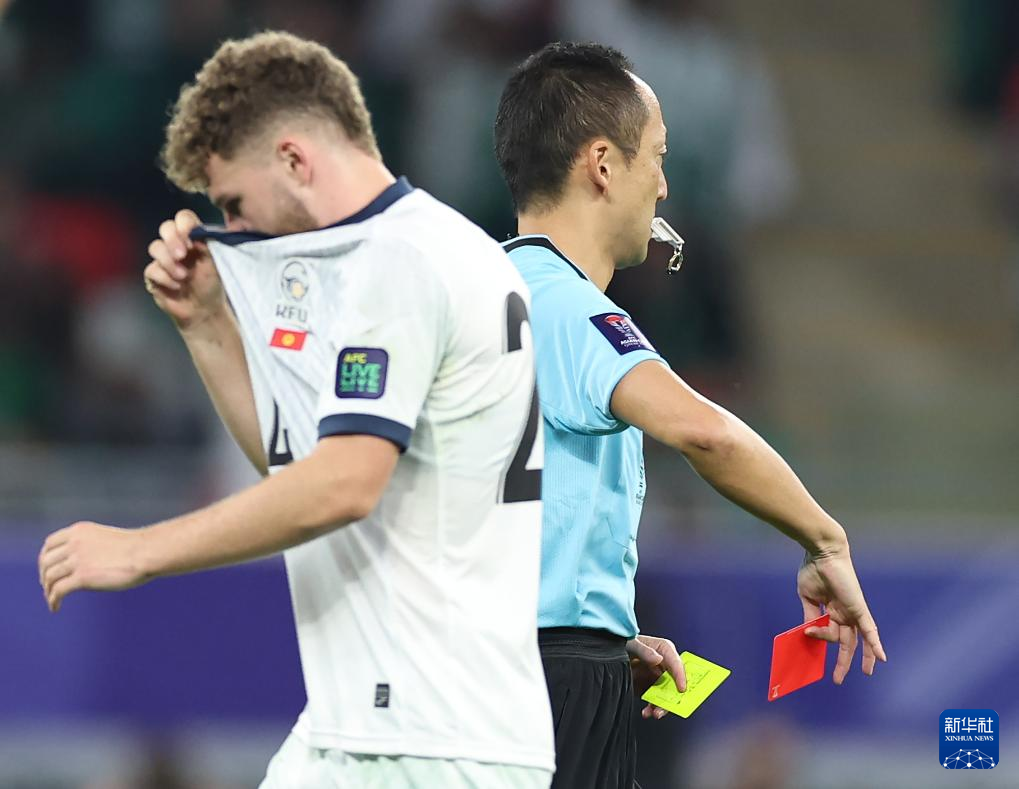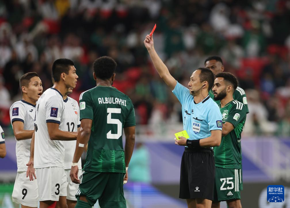 1月21日,主裁判饭田淳平(右三)向吉尔吉斯斯坦队球员阿克马托夫出示红牌。新华社记者 曹灿 摄