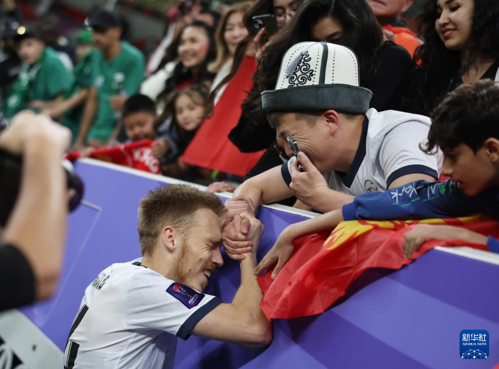 1月21日,吉尔吉斯斯坦队球员亚历山大·米先科(左)在比赛后与球迷互动。新华社记者 贾浩成 摄