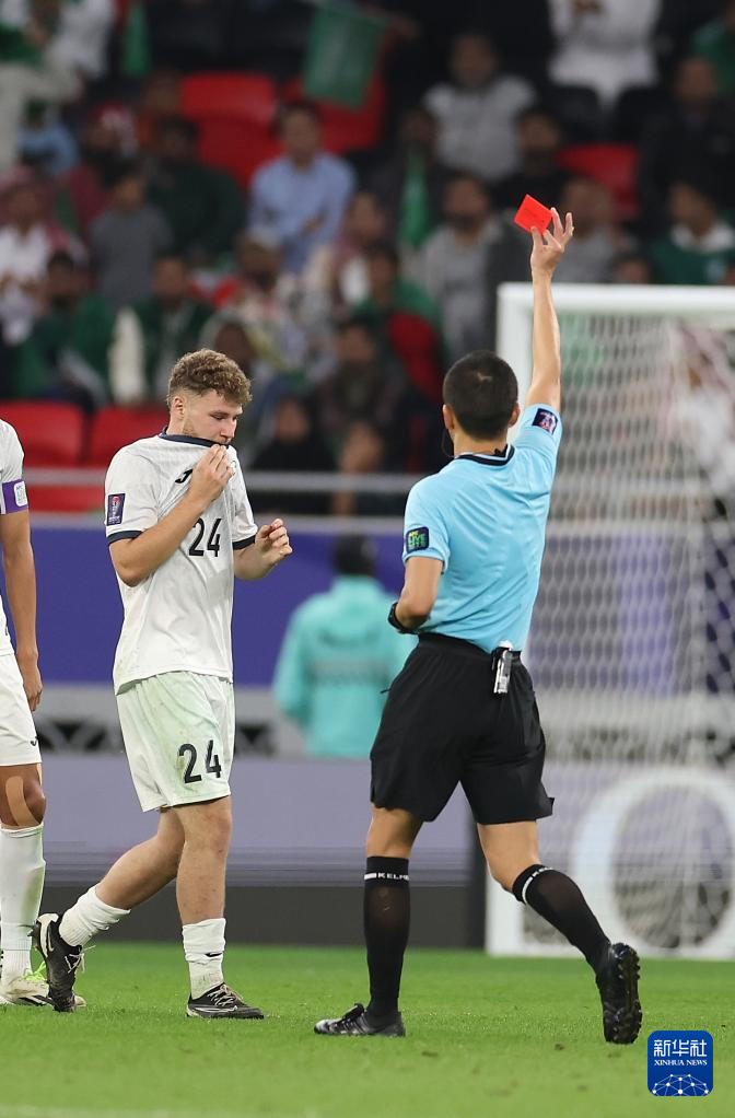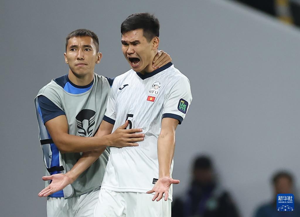 1月21日,吉尔吉斯斯坦队球员阿克马托夫(右)在比赛中被主裁判出示红牌后离场。新华社记者 贾浩成 摄