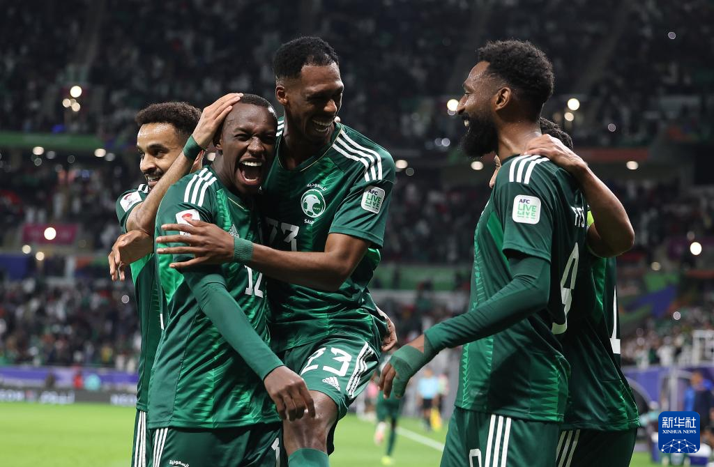 1月21日,沙特阿拉伯队球员穆罕默德·卡努(左二)在比赛中进球后与队友庆祝。新华社记者 贾浩成 摄