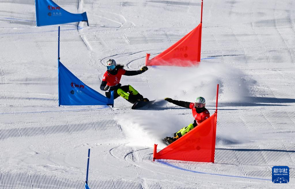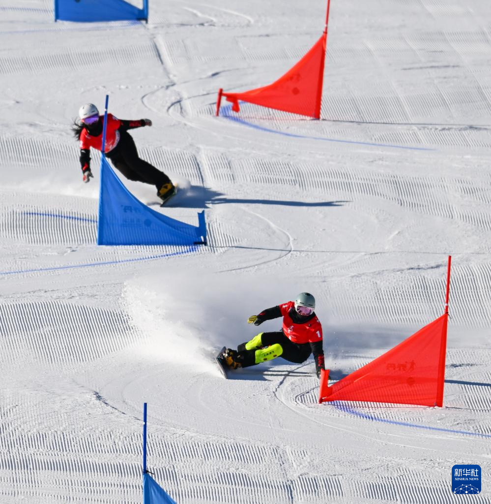 1月22日,湖北队选手李佳徽(下)在单板滑雪青年组女子平行大回转预赛中。新华社记者刘磊摄