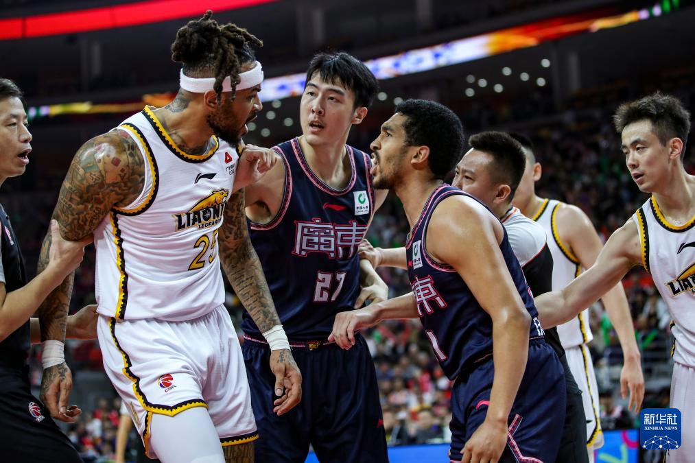 1月21日,广东华南虎队球员沃特斯(右四)与辽宁本钢队球员莫兰德(左二)在比赛中发生冲突。新华社发(郑家雄摄)