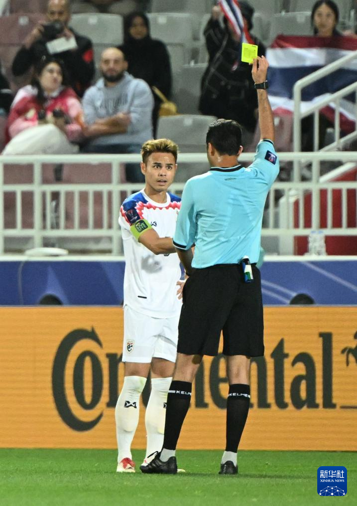 1月21日,主裁判向泰国队球员提拉通·汶马探(左)出示黄牌。新华社记者 孙凡越 摄