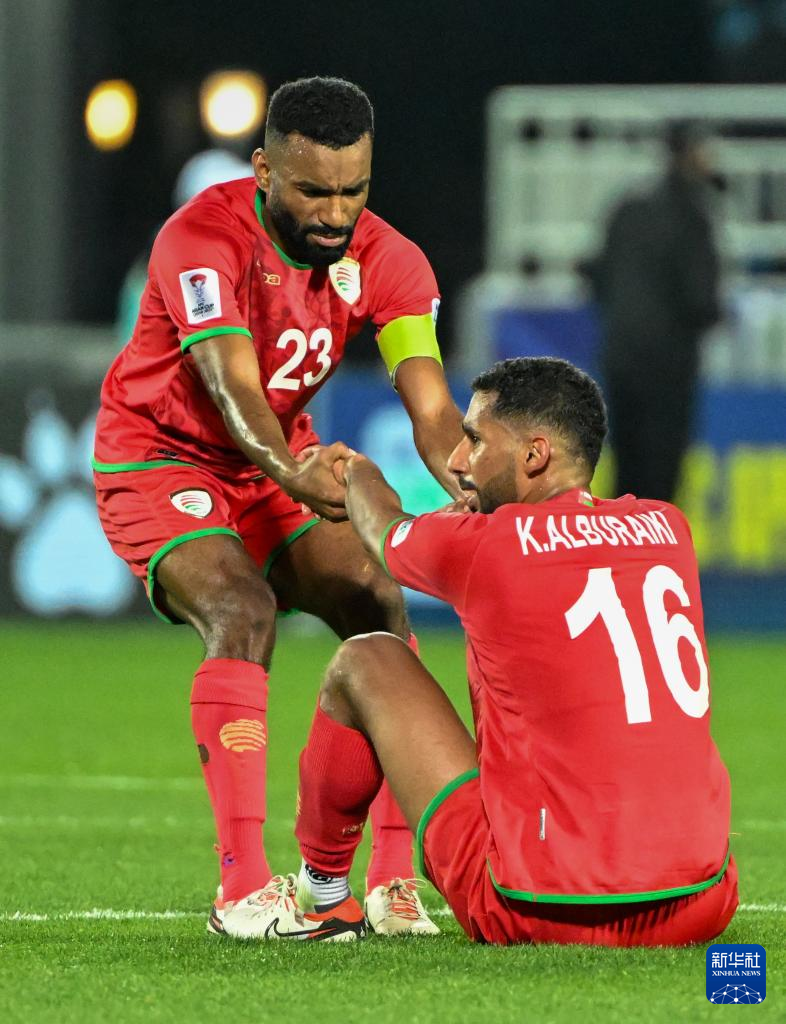1月21日,阿曼队球员哈里卜·萨阿迪(左)在比赛后将队友哈立德·布拉伊基拉起。新华社记者 孙凡越 摄