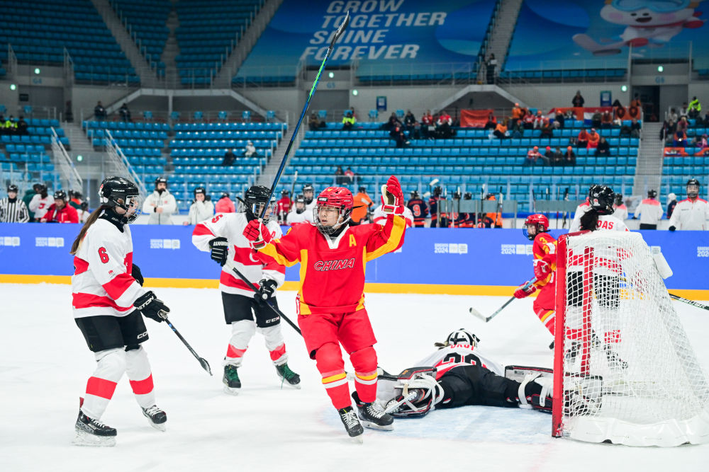 1月22日,中国队球员寇宸菲在比赛中庆祝进球。当日,在韩国江陵进行的2024年江原道冬青奥会女子冰球3对3预赛中,中国队9:2战胜土耳其队。新华社记者 朱炜 摄