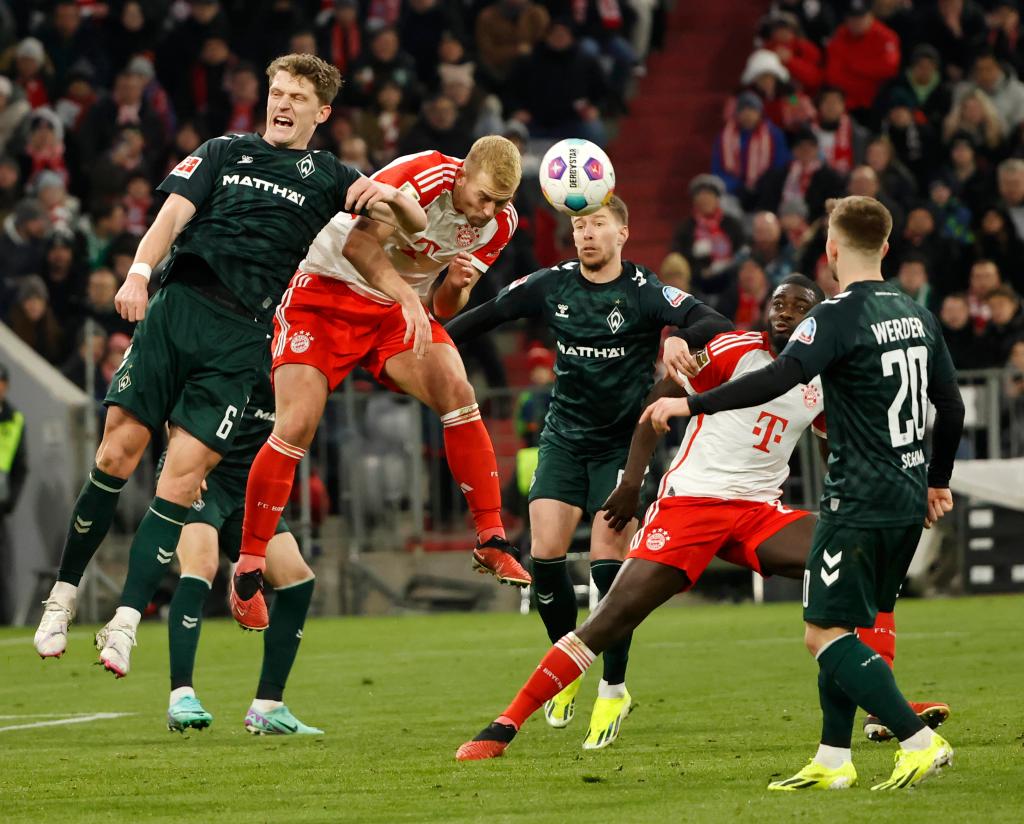 1月21日,拜仁慕尼黑队球员德利赫特(左二)在比赛中与云达不来梅队球员施塔格(左一)争顶。新华社发(菲利普·鲁伊兹摄)