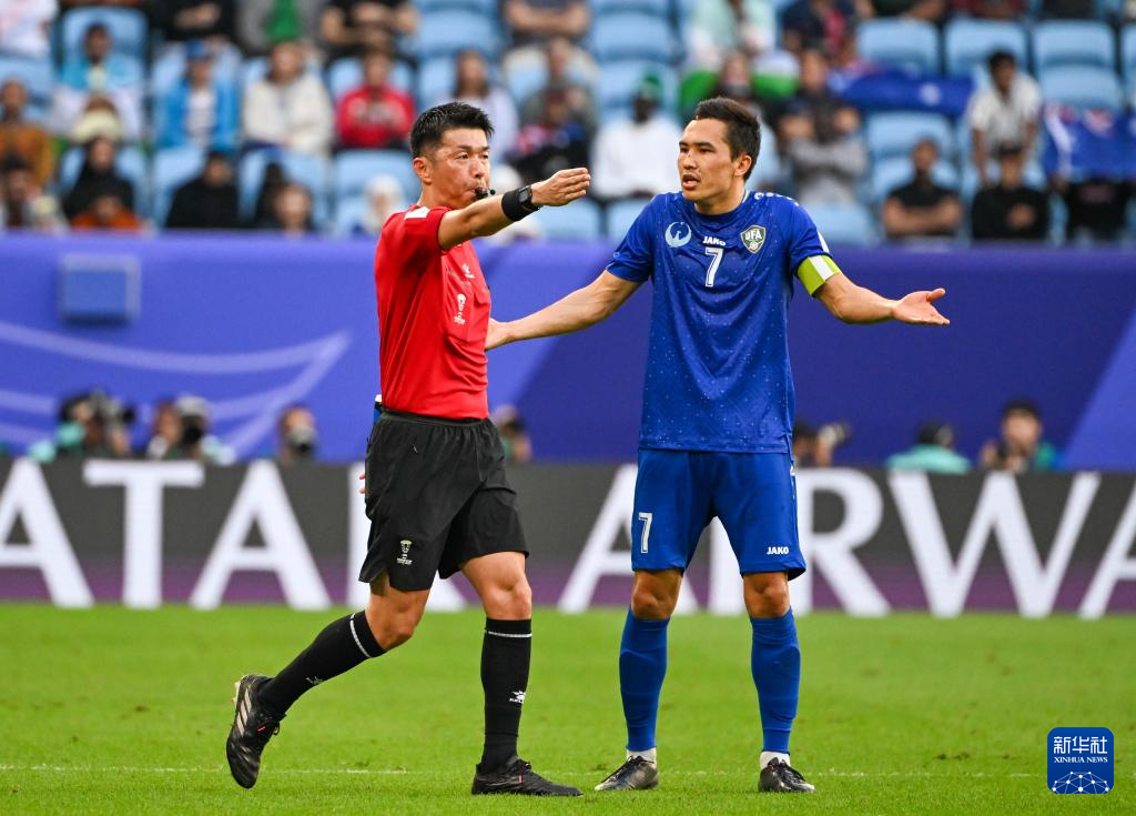1月23日,乌兹别克斯坦队球员舒库罗夫(右)对主裁判改判点球质疑。新华社记者 孙凡越 摄