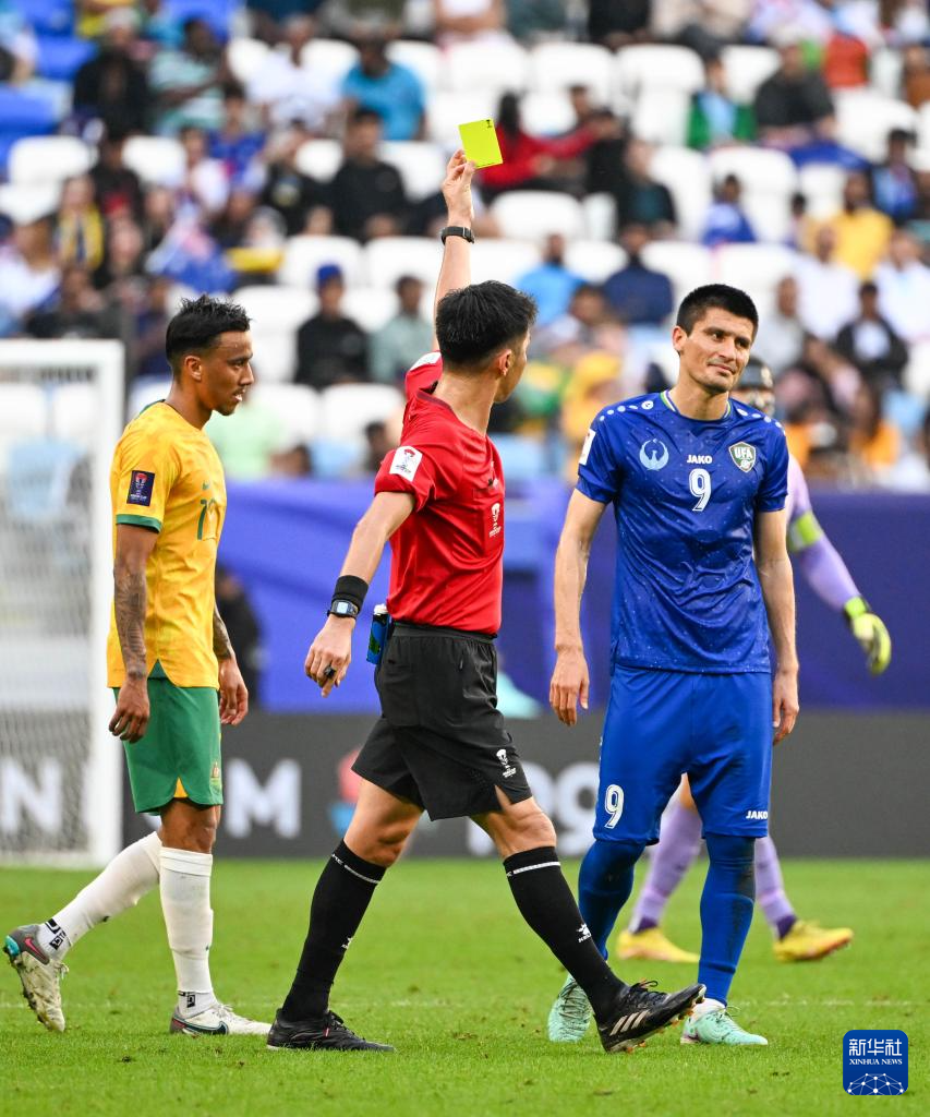1月23日,主裁判向乌兹别克斯坦队球员哈姆罗别科夫(右)出示黄牌。新华社记者 孙凡越 摄