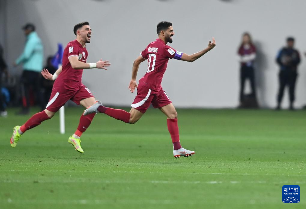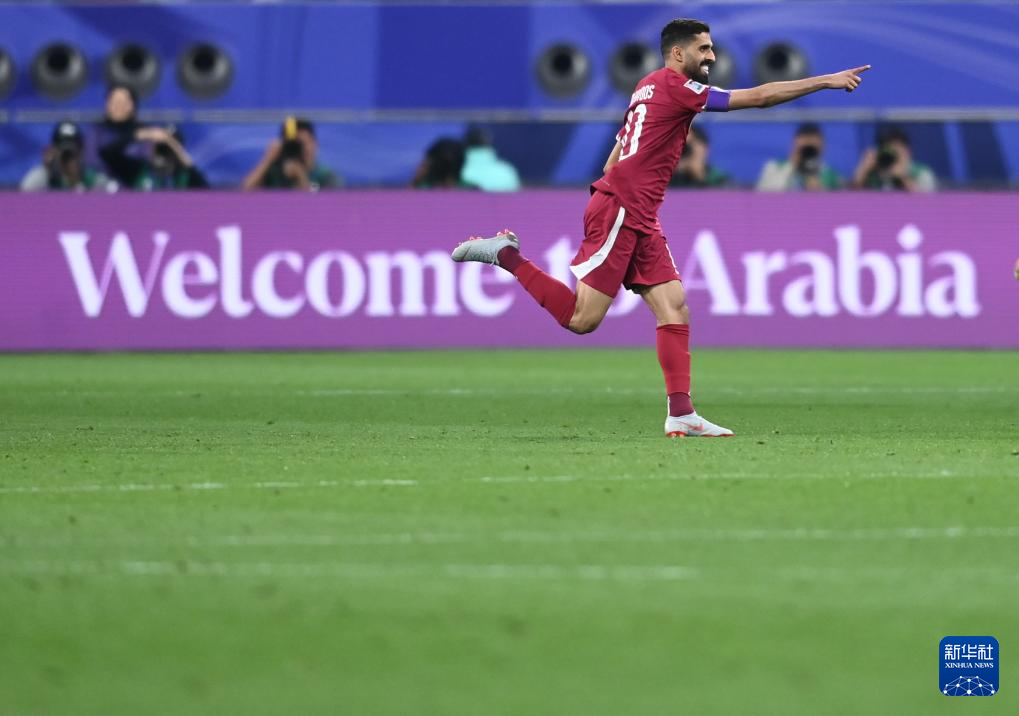1月22日,卡塔尔队球员哈桑·海多斯进球后庆祝。新华社记者 江汉 摄