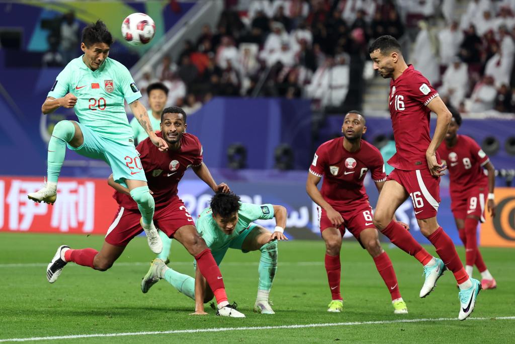 1月22日,中国队球员张玉宁(左)与卡塔尔队球员阿卜杜勒·哈特姆争顶。新华社记者 曹灿 摄