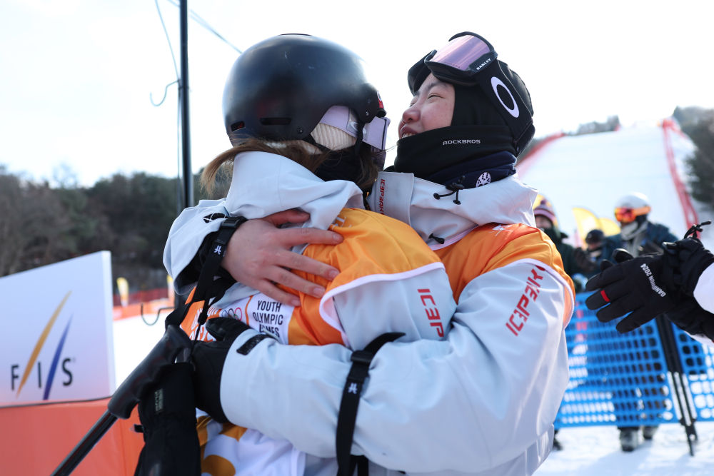 1月24日,韩林杉(右)在比赛后与队友肖思雨拥抱庆祝。新华社记者 李明 摄