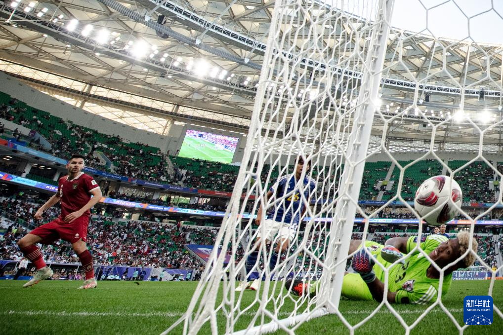 1月24日,印度尼西亚队守门员埃尔南多·阿里·苏塔尔亚迪(左二)在比赛中扑救。新华社记者 江汉 摄
