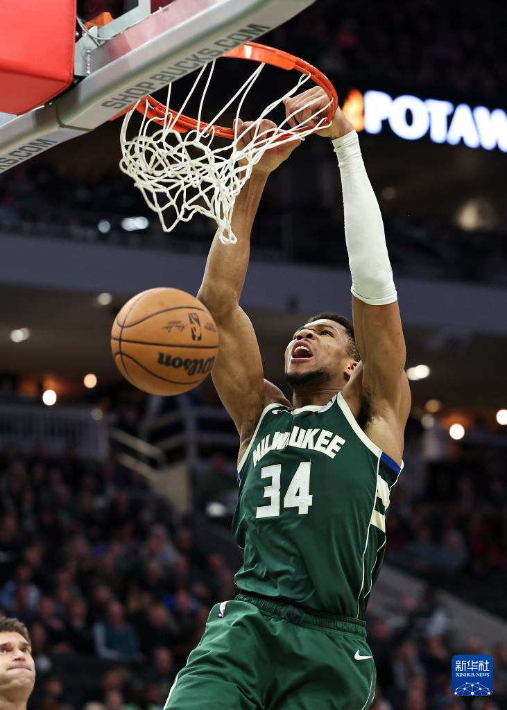 1月24日,雄鹿队球员安特托昆博在比赛中扣篮。新华社发(乔尔·莱纳摄)