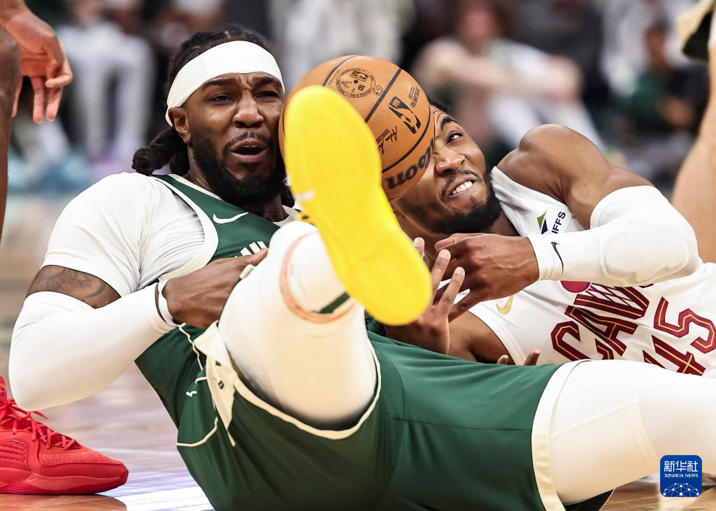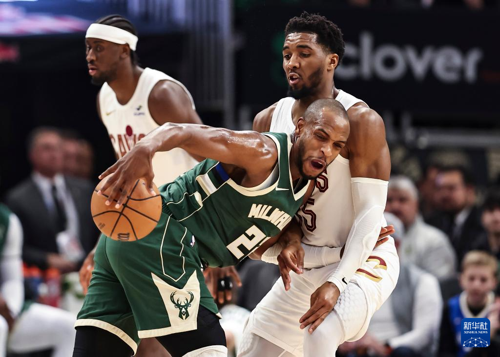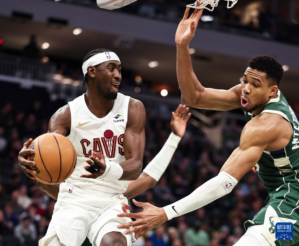 1月24日,雄鹿队球员克劳德(左)与骑士队球员米切尔在比赛中争抢。新华社发(乔尔·莱纳摄)