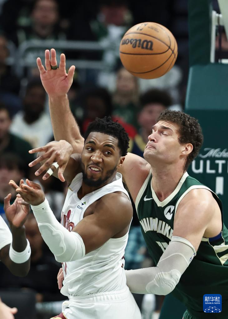 1月24日,雄鹿队球员洛佩兹(右)与骑士队球员米切尔在比赛中争抢。新华社发(乔尔·莱纳摄)