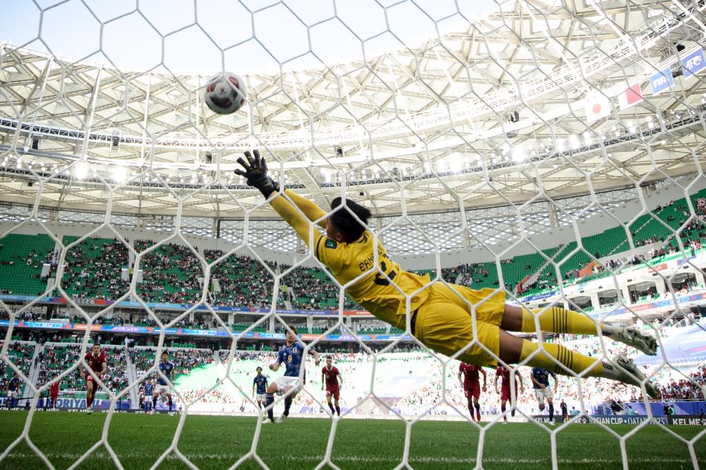 1月24日,印尼队守门员埃尔南多·阿里·苏塔尔亚迪(前)在比赛中未能扑出日本队球员上田绮世的点球。新华社记者 江汉 摄