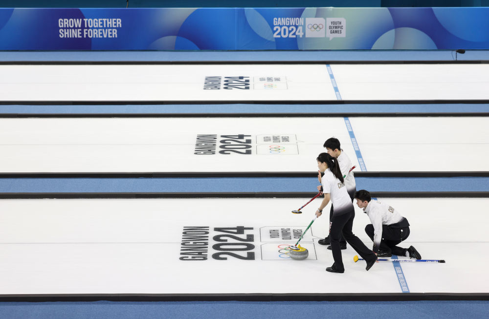 1月20日,2024年江原道冬青奥会冰壶混合团体循环赛在韩国江陵进行。新华社记者 胡虎虎 摄
