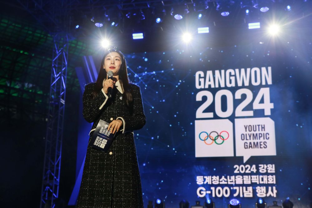 2023年10月11日,韩国花滑名将金妍儿在2024年江原道冬青奥会倒计时100天活动致辞。新华社发(杨畅摄)