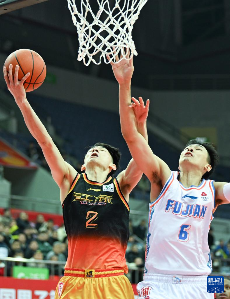 1月25日,江苏肯帝亚队球员马建豪(左)在福建浔兴股份队球员邹阳的防守下上篮。新华社发(王须中摄)
