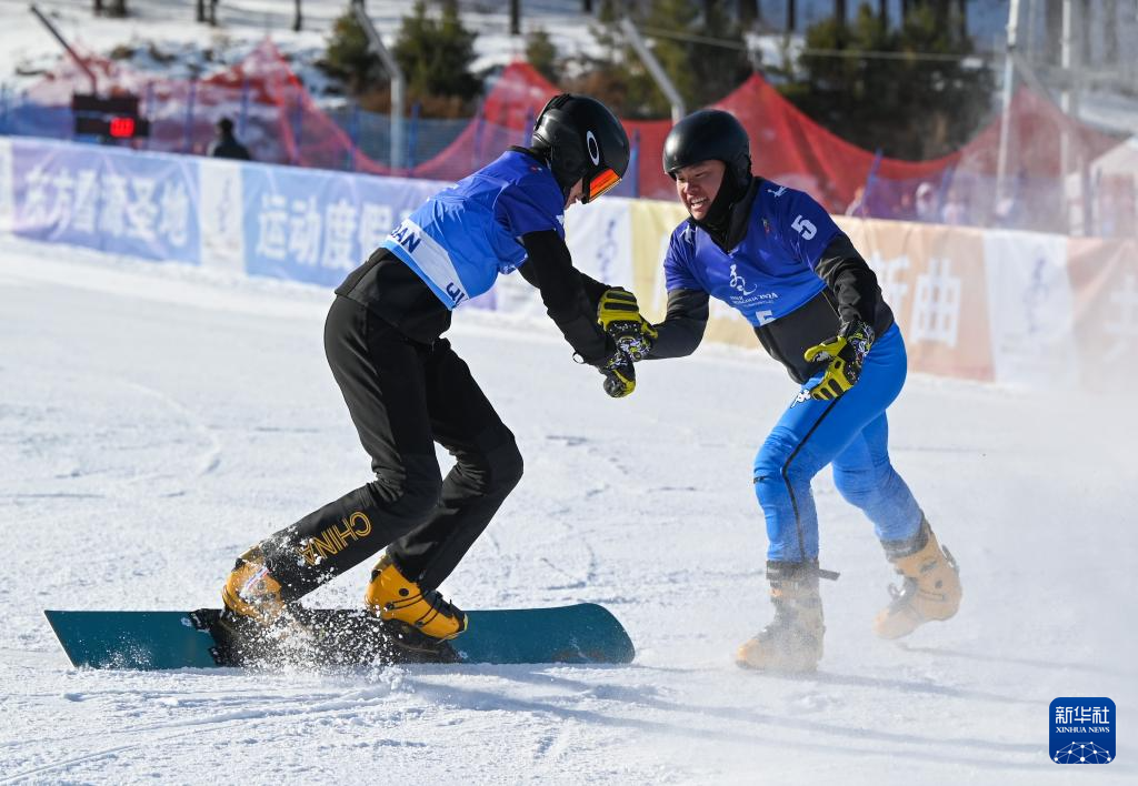 1月25日,内蒙古队选手班学福(左)在比赛结束后和队友丁雪东庆祝。新华社记者 刘磊 摄