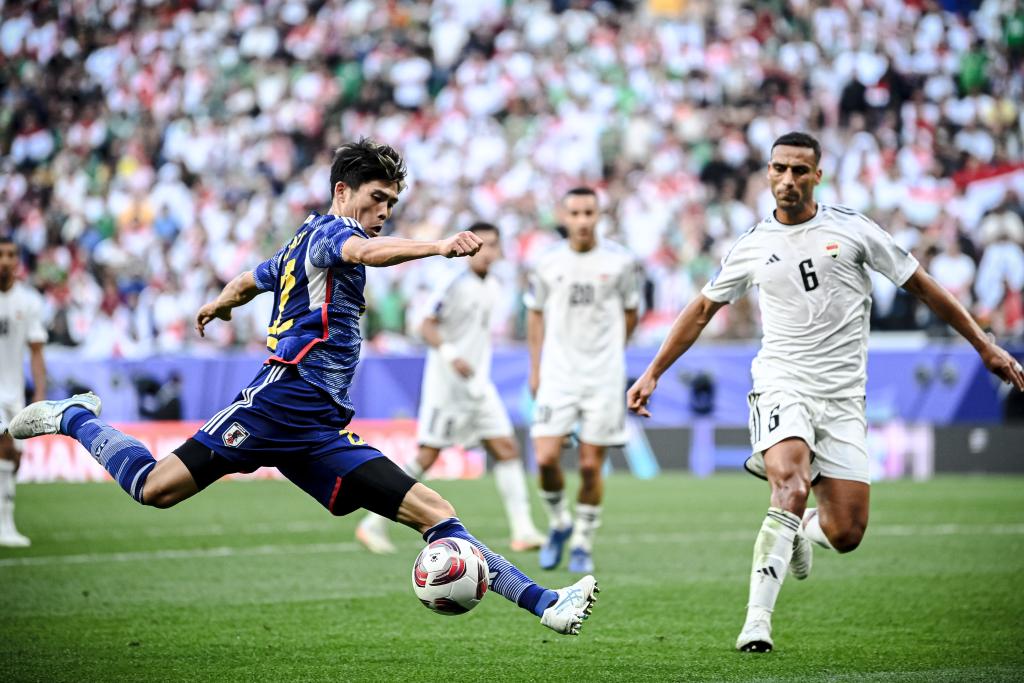 1月19日,日本队球员富安健洋(左)在对阵伊拉克队的比赛中射门。新华社记者 江汉 摄
