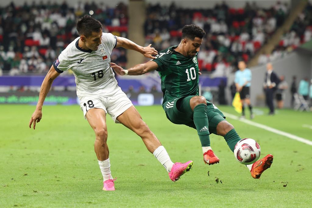 1月21日,吉尔吉斯斯坦队球员凯拉特(左)与沙特队球员达瓦萨里在比赛中拼抢。新华社记者 曹灿 摄