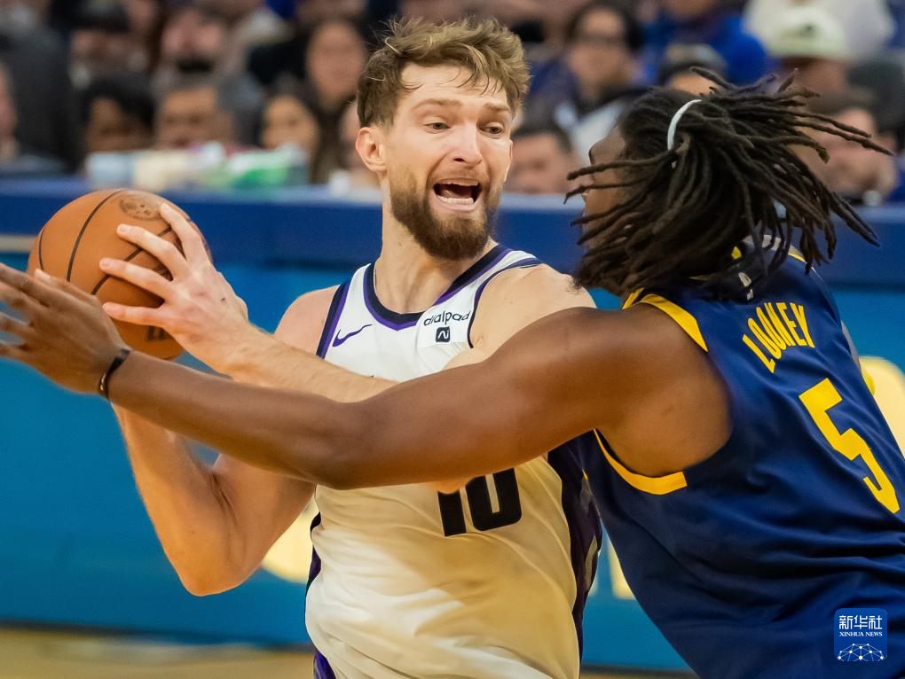 1月25日,勇士队球员卢尼(右)在比赛中防守国王队球员多曼塔斯·萨博尼斯 。新华社发(董旭东摄)