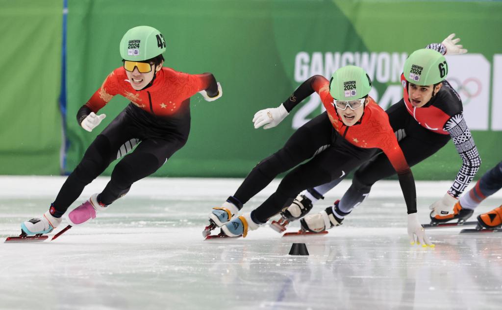 1月21日,张心喆(中)和队友张柏浩(左)在男子1000米决赛中。新华社记者 姚琪琳 摄