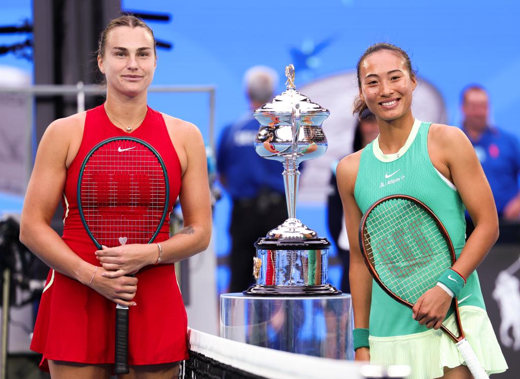 1月27日,郑钦文与萨巴伦卡在赛前与奖杯合影。新华社记者 马平 摄