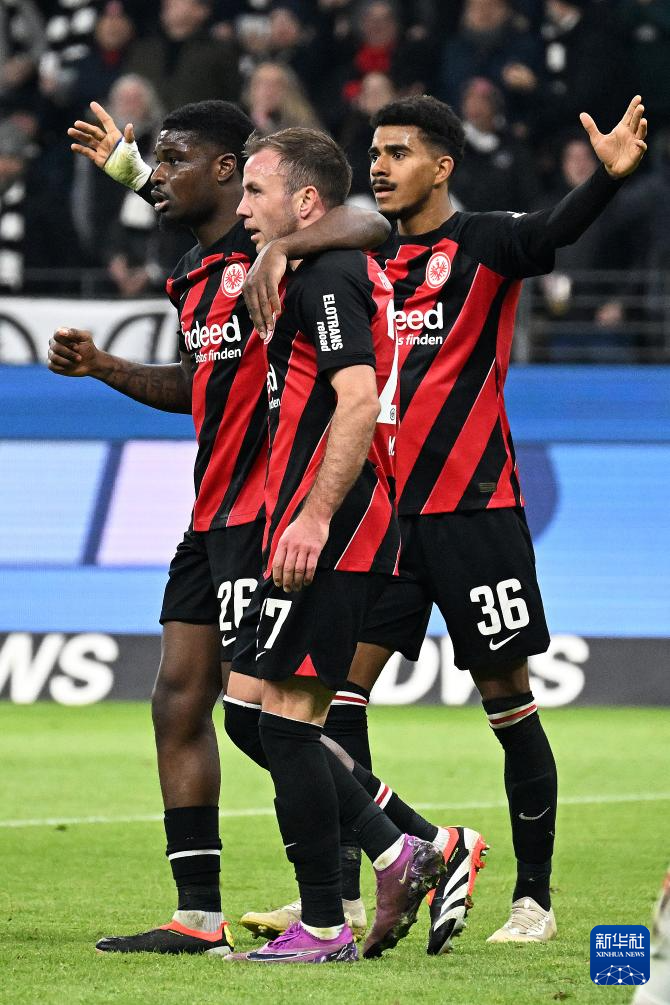 1月26日,法兰克福队格策(中)进球后与队友庆祝。新华社发(乌尔里希·胡夫纳格尔 摄)