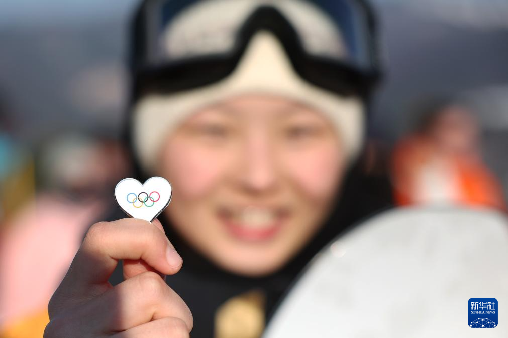 1月28日,张小楠在赛后展示国际奥委会主席巴赫赠送的徽章。新华社记者 李明 摄