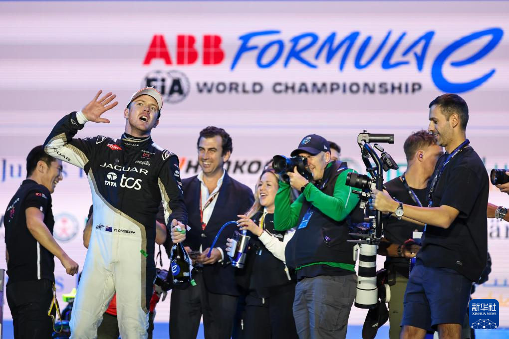 1月27日,捷豹TCS车队新西兰车手尼克·卡西迪(左一)赛后庆祝胜利。他以43分51秒868的成绩获得冠军。新华社发(钱俊摄)