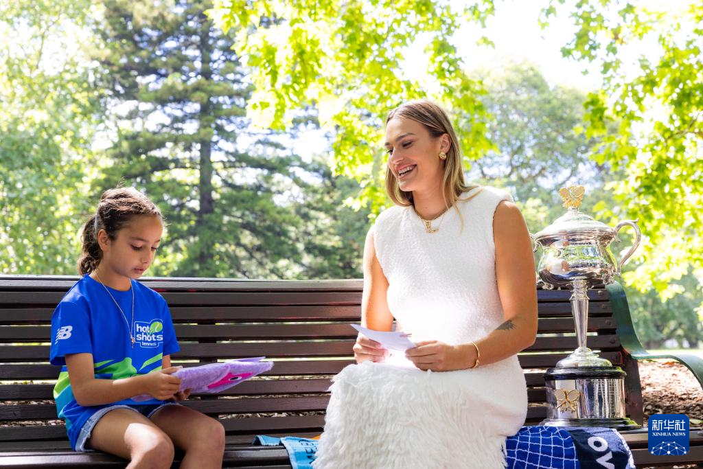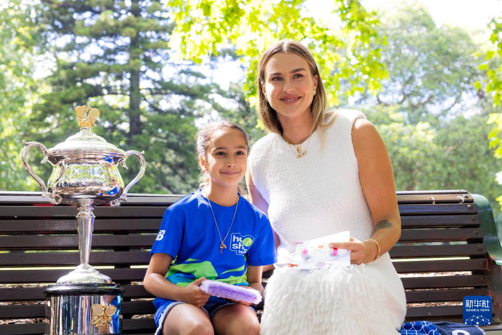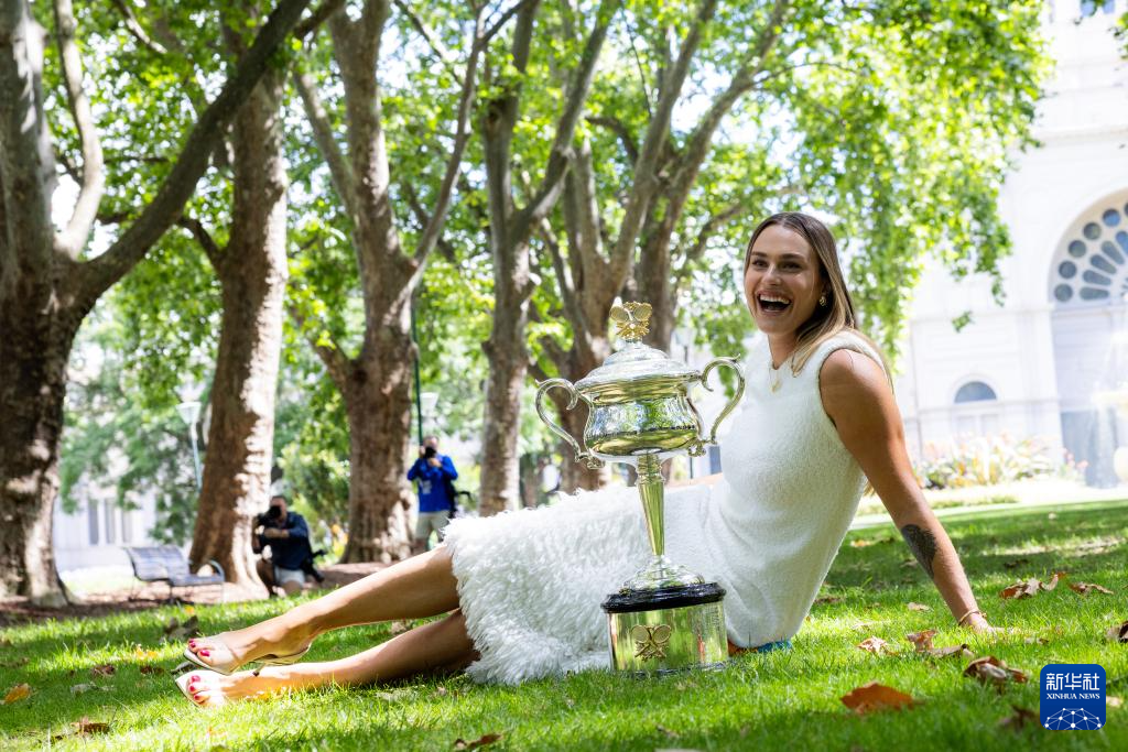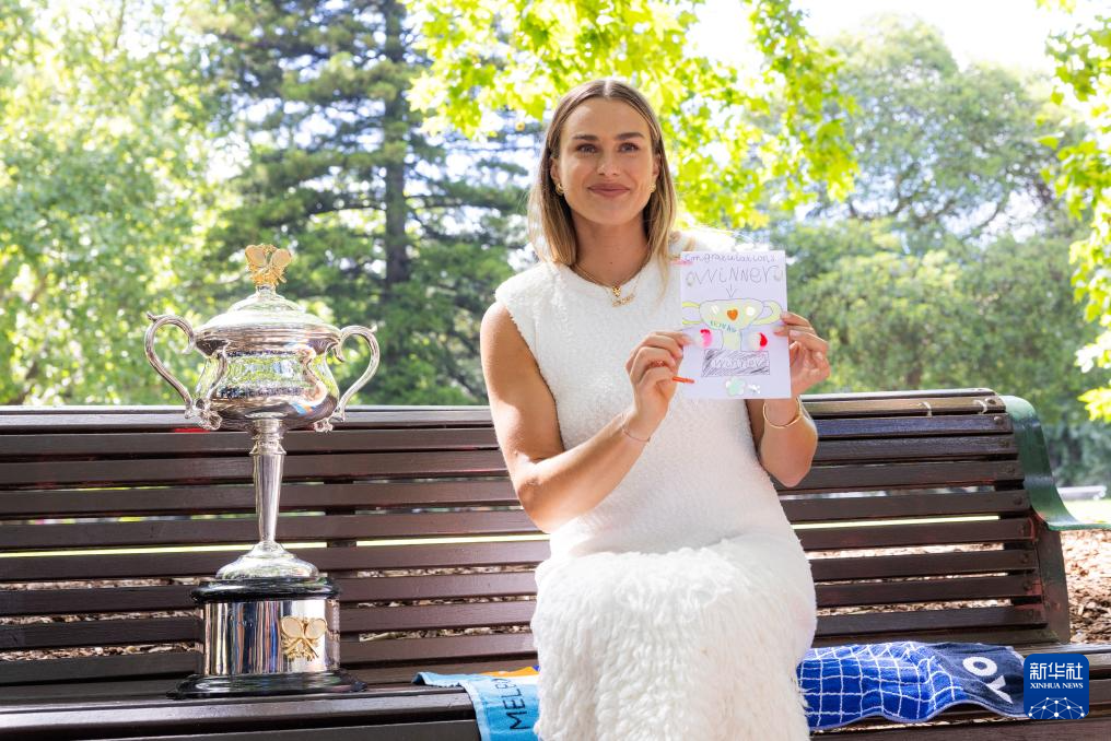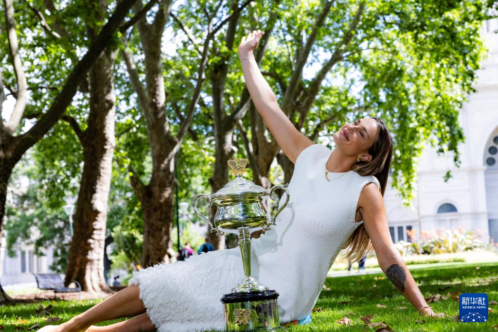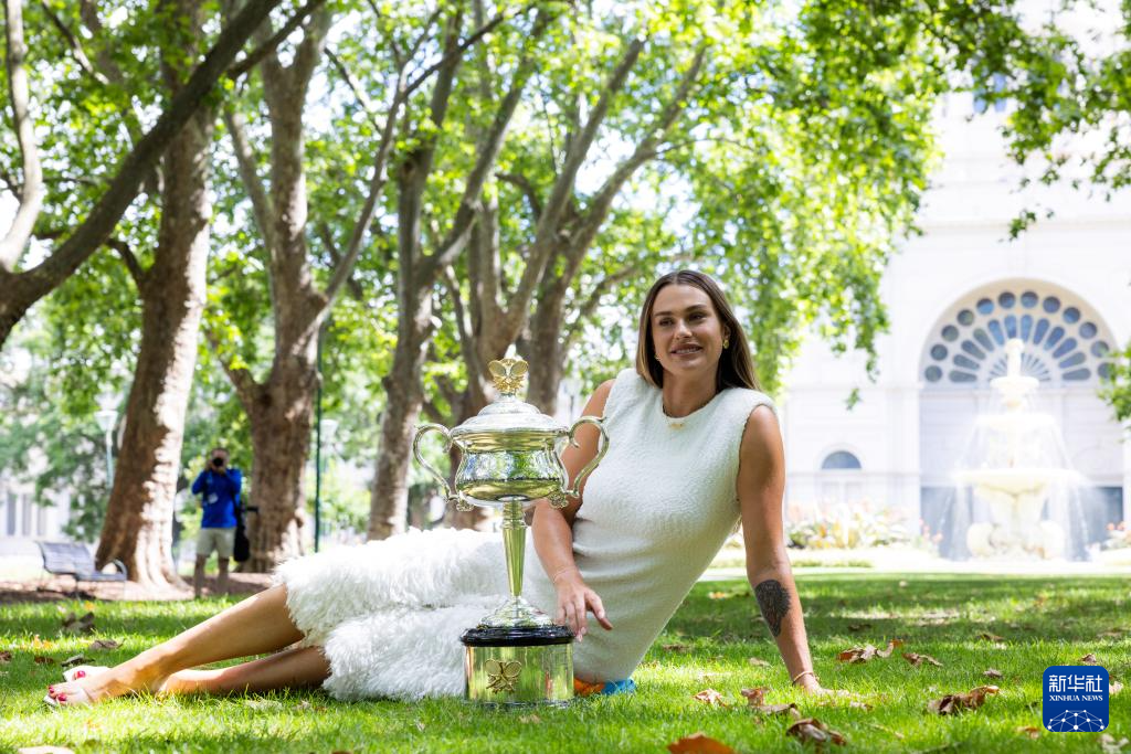 当日,2024年澳大利亚网球公开赛女子单打冠军、白俄罗斯选手萨巴伦卡在墨尔本卡尔顿园林皇家展览馆前展示冠军奖杯。