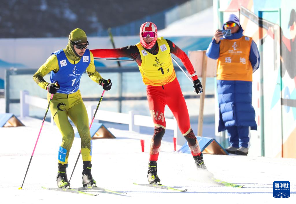 1月28日,黑龙江选手范海斌(右)与队友赵嘉文在越野滑雪接力赛中交接。新华社发(武殿森摄)