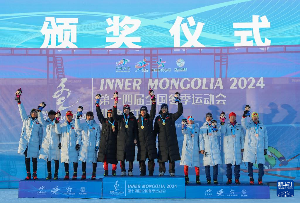 1月28日,冠军黑龙江队队员(中)、亚军吉林队队员(左)和季军四川队队员在颁奖台上合影。新华社发(武殿森摄)