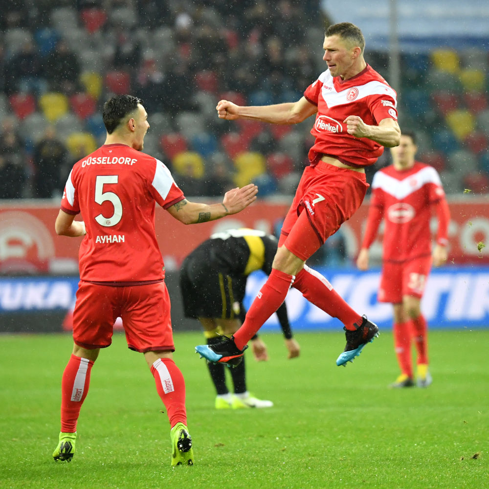2019年,杜塞尔多夫队球员芬克(右)在2018-2019赛季德国足球甲级联赛庆祝进球。新华社发(乌尔里希·胡夫纳格尔摄)