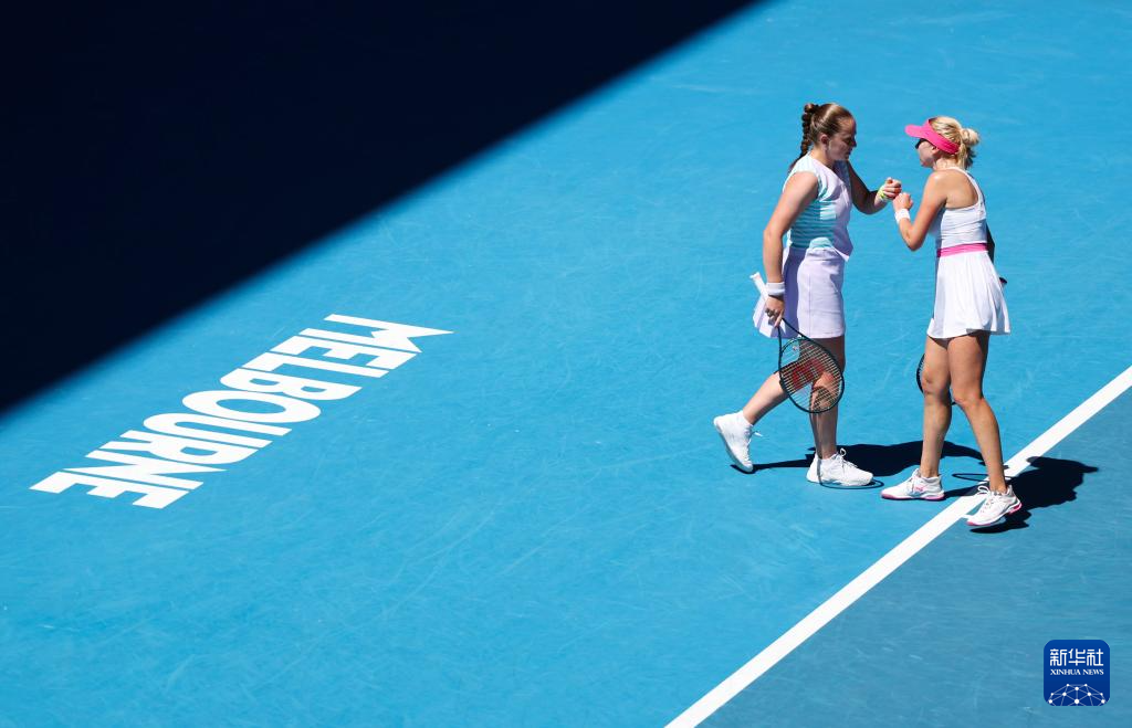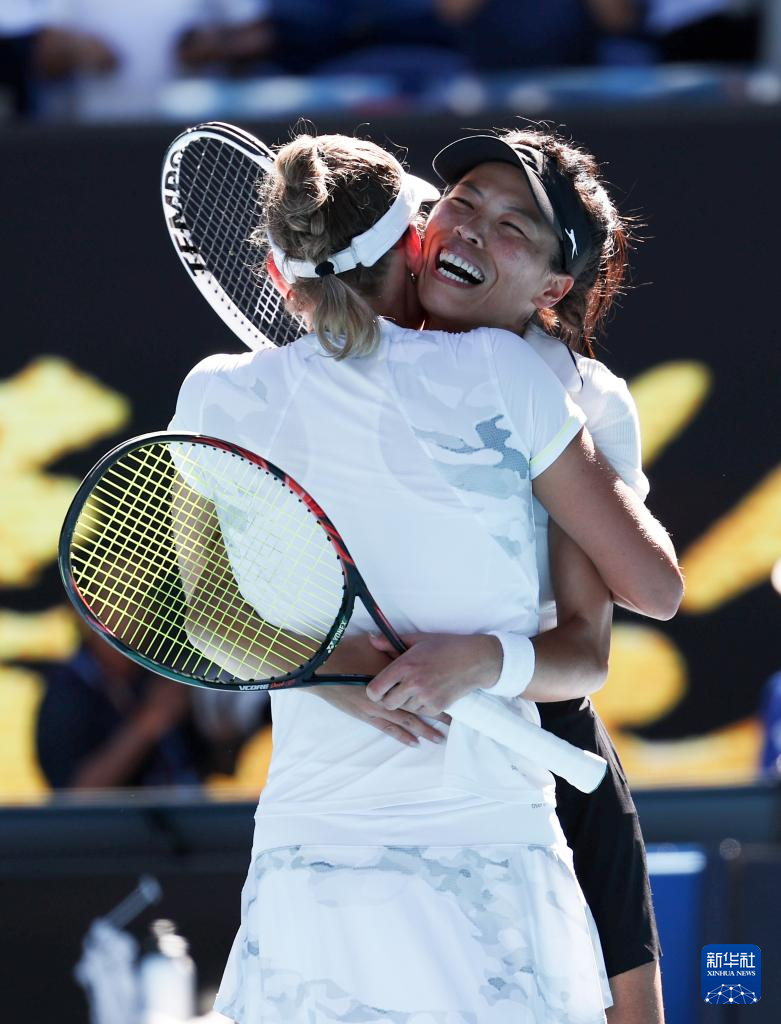 1月28日,谢淑薇(右)/梅尔滕斯庆祝胜利。新华社记者 马平 摄