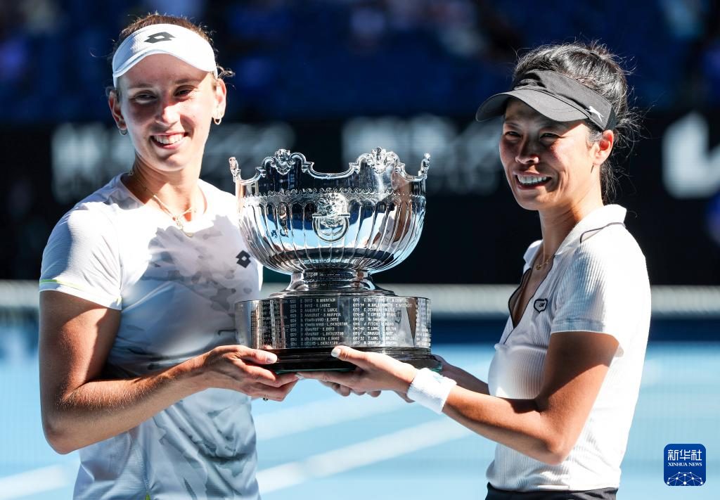 1月28日,谢淑薇(右)/梅尔滕斯展示奖杯。新华社记者 马平 摄